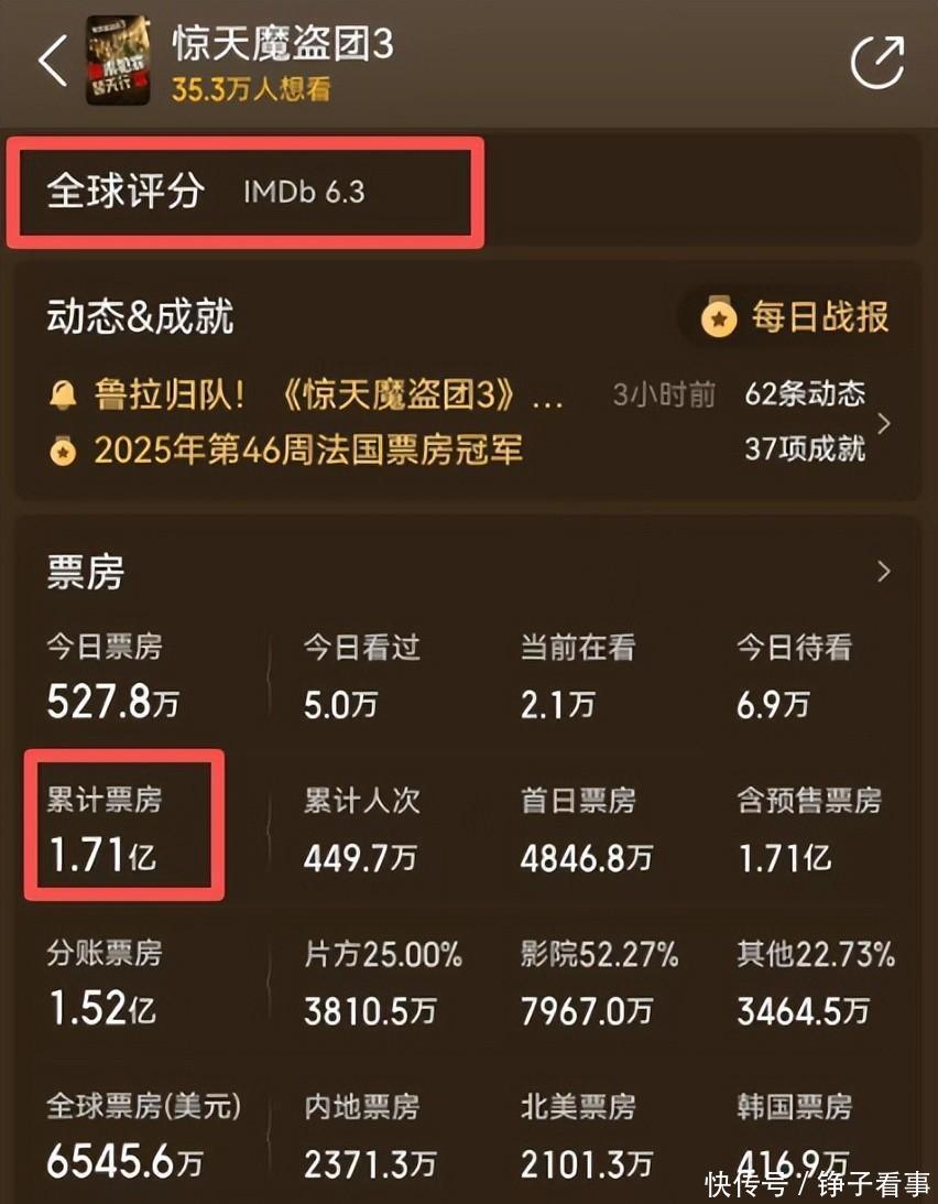 豆瓣角落里《惊天魔盗团 3》拿了 6.3 分,这个曾经火遍全球的系列,如今彻底没了当年的风头。预估总票房才 3 亿,看这架势还得往下走,跟同档期的《鬼灭之刃》影版一较劲儿,差距立马就显出来了,单日票房居然跌到 500 万,实在让人意外。 十多年前的前两部多能打啊,平均票房飙到 24 亿往上。那种用戏法行侠仗义的设定,让观众在虚幻和现实间来回琢磨,反转一个接一个,当年看的时候真觉得惊掉下巴。可隔了 9 年再回归,网上全是吐槽的声音,老粉们清一色打低分,说 “所有人都跟没感情的工具人似的”“全程摸不着头脑”“要不是念旧谁会看”。